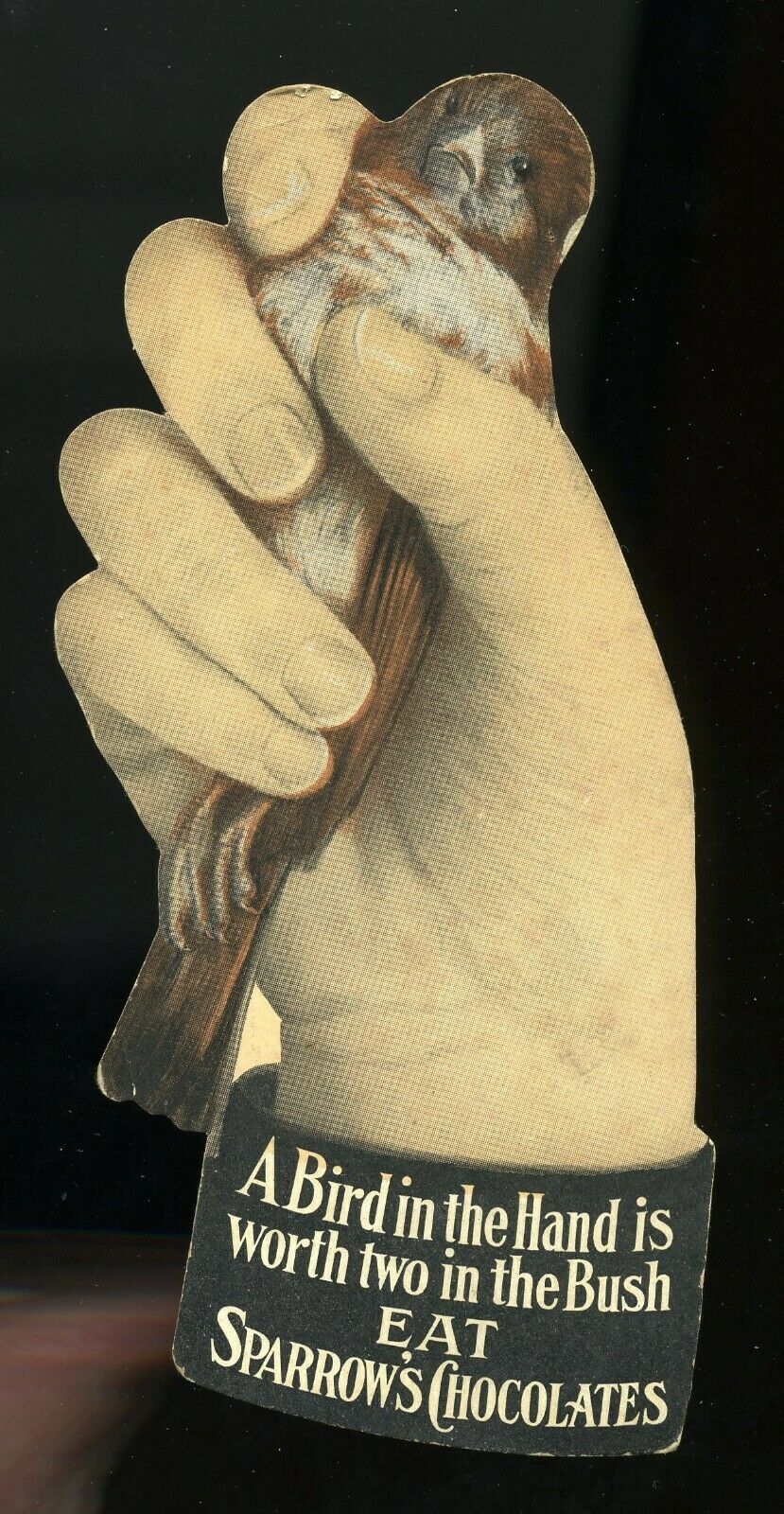 Title (ebay affiliate link): DIE CUT BIRD IN THE HAND IMAGE, EAST SPARROWS CHOCOLATES, BOOKMARK