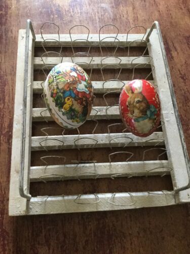 Title (ebay affiliate link): Antique Vintage Rustic Wooden Wire EGG RACK STAND Holder w/ 2 paper mache eggs