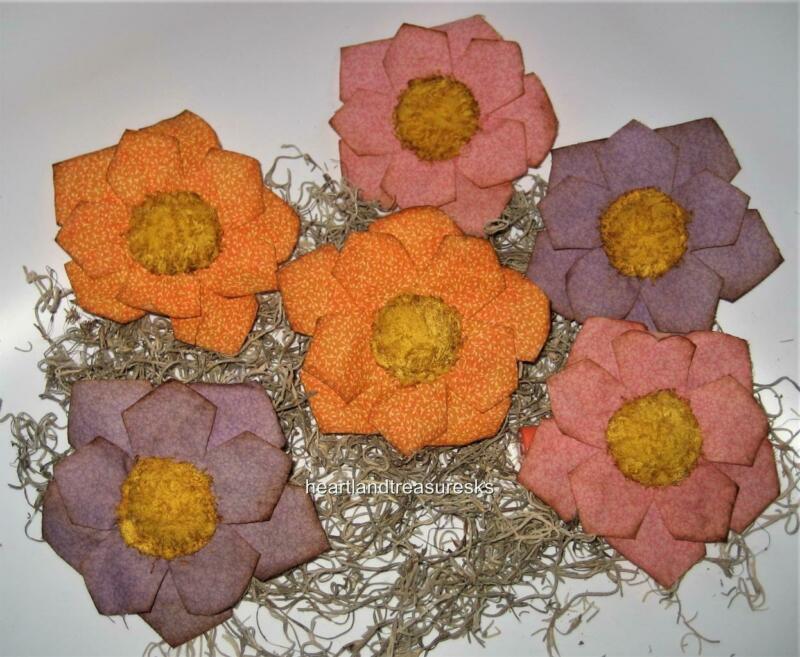 6 ~ Prim Spring Fabric Flower Bud Bowl Fillers / Ornies Orange ~ Pink ~ Lavender