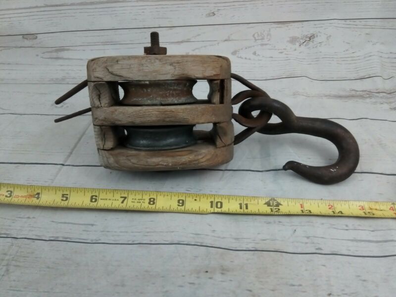 Title (ebay affiliate link): Vintage Double wheel wooden HEAVY DUTY Cast Iron Antique Primitive BARN PULLEY