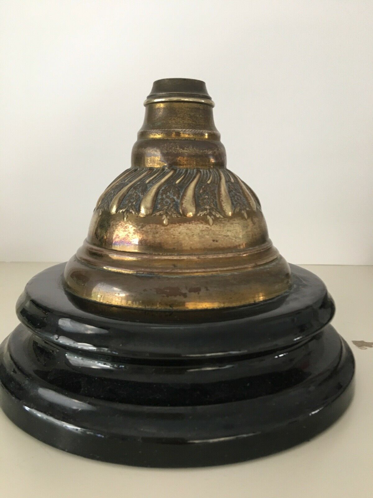 Title (ebay affiliate link): antique black terracota oil lamp base, with a brass circular design