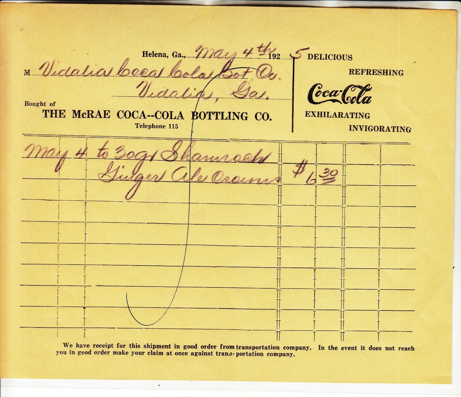 THE McRAE COCA-COLA BOTTLING CO. INVOICE DATED MAY 4th, 1925, 94 years old
