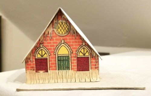 Title (ebay affiliate link): Red Brick, Windows. Cardboard House, Icicles on Roof. USA. 1930s. Putz House