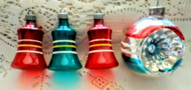 Title (ebay affiliate link): Vtg Christmas Tree 4 Ornaments Shiny Brite Unsilvered Bells Patriotic Indent RWB