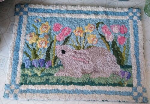 Title (ebay affiliate link): PRIMITIVE Pictorial Bunny Rabbit Hook Rug w Tulips Daffodils