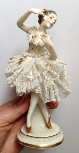 Title (ebay affiliate link): Vintage Dresden Ballerina 8" Figurine white & Gold Porcelain Lace #1901