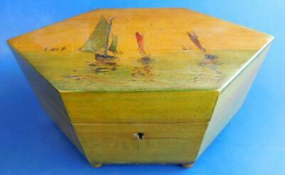 Title (ebay affiliate link): Elegant Edwardian Pokerwork Wood Hex Shaped Tea Caddy Trinket Box 1900s