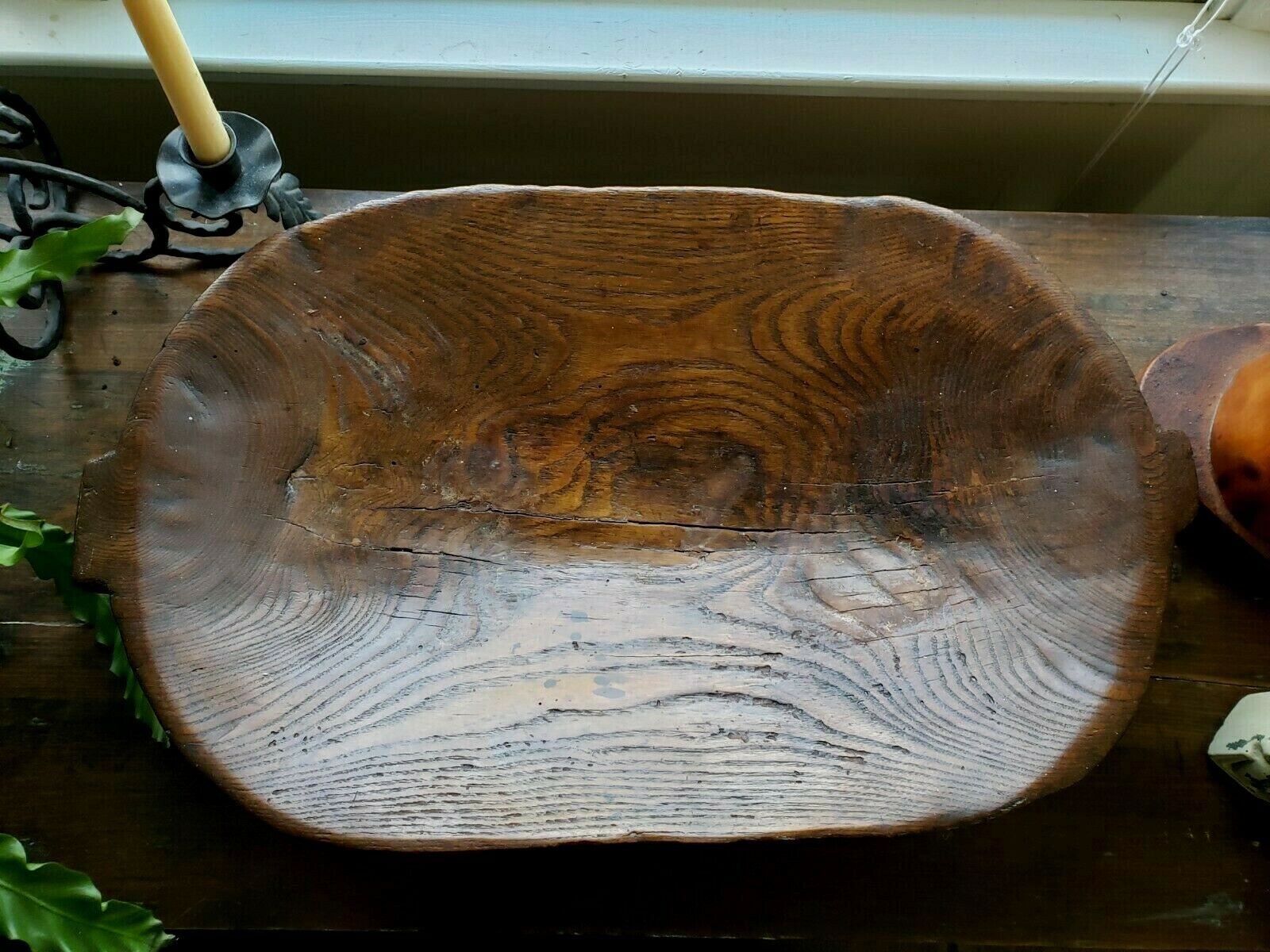 Title (ebay affiliate link): XL Vintage Antique Primitive Hand Carved Wooden Dough Trench Bowl 24" L