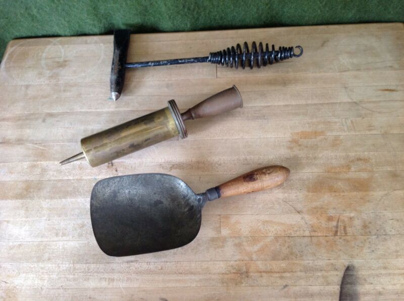 Title (ebay affiliate link): Lot 3 Vintage tools: Scoop w wood handle, brass Oil Can & Welders Tool w spiral
