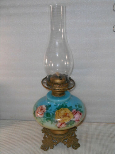 Antique PG Co Blue Milk Glass GWTW HURRICANE OIL LAMP Hand Painted ROSES Floral
