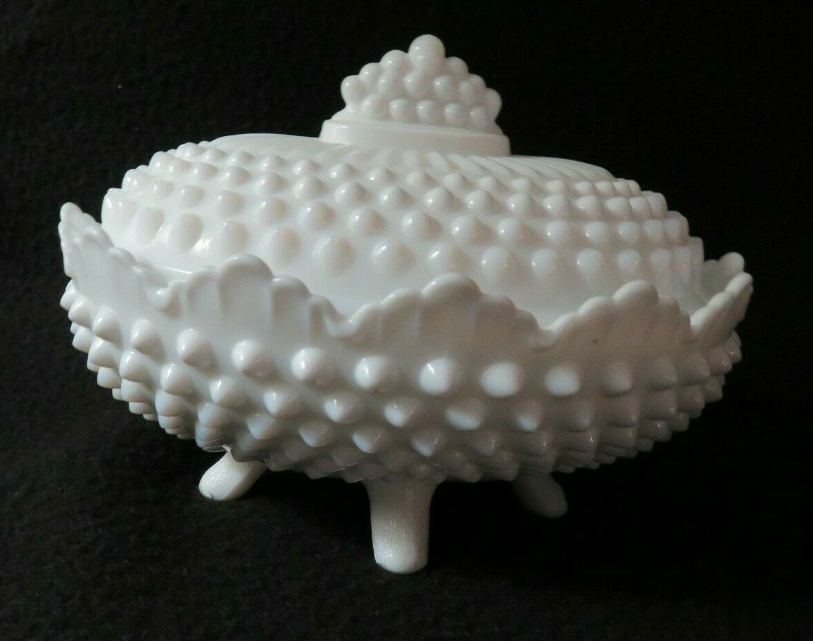 Title (ebay affiliate link): Fenton Milk Glass, Hobnail, Candy Dish on 3 feet, with lid, excellent condition