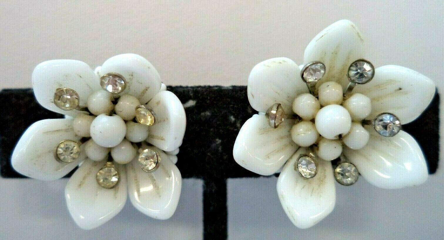 VINTAGE SIGNED W GERMANY MILK GLASS RHINESTONE FLOWER 7/8" SCREW EARRINGS! 1990Y