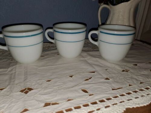 3 Corning Pyrex Turquoise Blue Stripe Mug Restaurant Military Ware milk glass