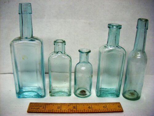 Title (ebay affiliate link): Lot of (5) Mold-Blown Aqua Household - Apothecary - Medicine Bottles