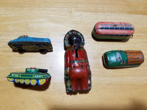 Title (ebay affiliate link): 5 pc. Vintage Collectible Tin Toy Lot, Tank, Bank, 2 Trucks, Cable Car