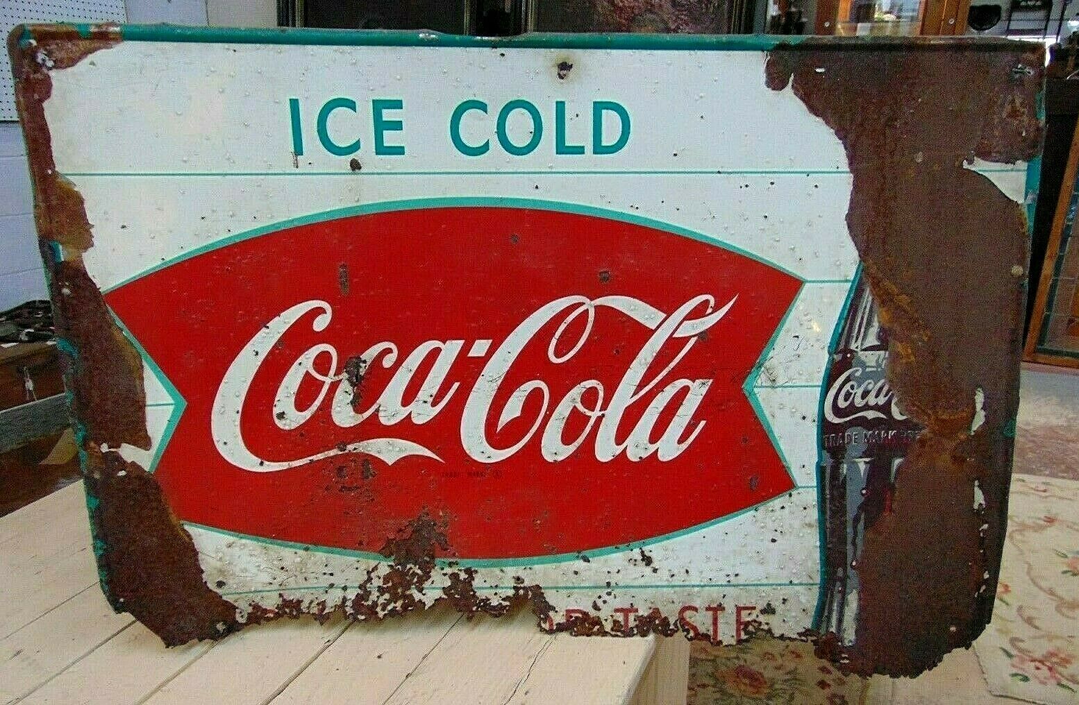 Title (ebay affiliate link): VINTAGE ORIGINAL COCA-COLA TIN SIGN BOTTLE BOWTIE FISHTAIL ICE COLD COKE AS IS