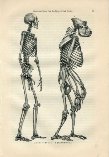 Title (ebay affiliate link): 1887 SKELETON HUMAN and GORILLA SKELETON Antique Engraving Print J.Ranke
