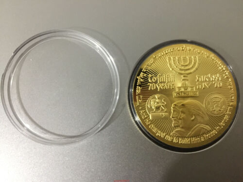Title (ebay affiliate link): 70 Years King Cyrus Donald Trump Jewish Temple Israel Jerusalem gold color Coin