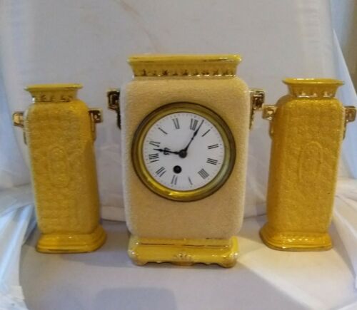 ANTIQUE VICTORIAN? POTTERY CLOCK GARNITURE* SINGLE TRAIN MOVEMENT*