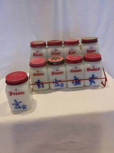 Title (ebay affiliate link): 9 Vintage White Milk Glass Dutch Delft design Spice Shakers jars w/ Metal Rack
