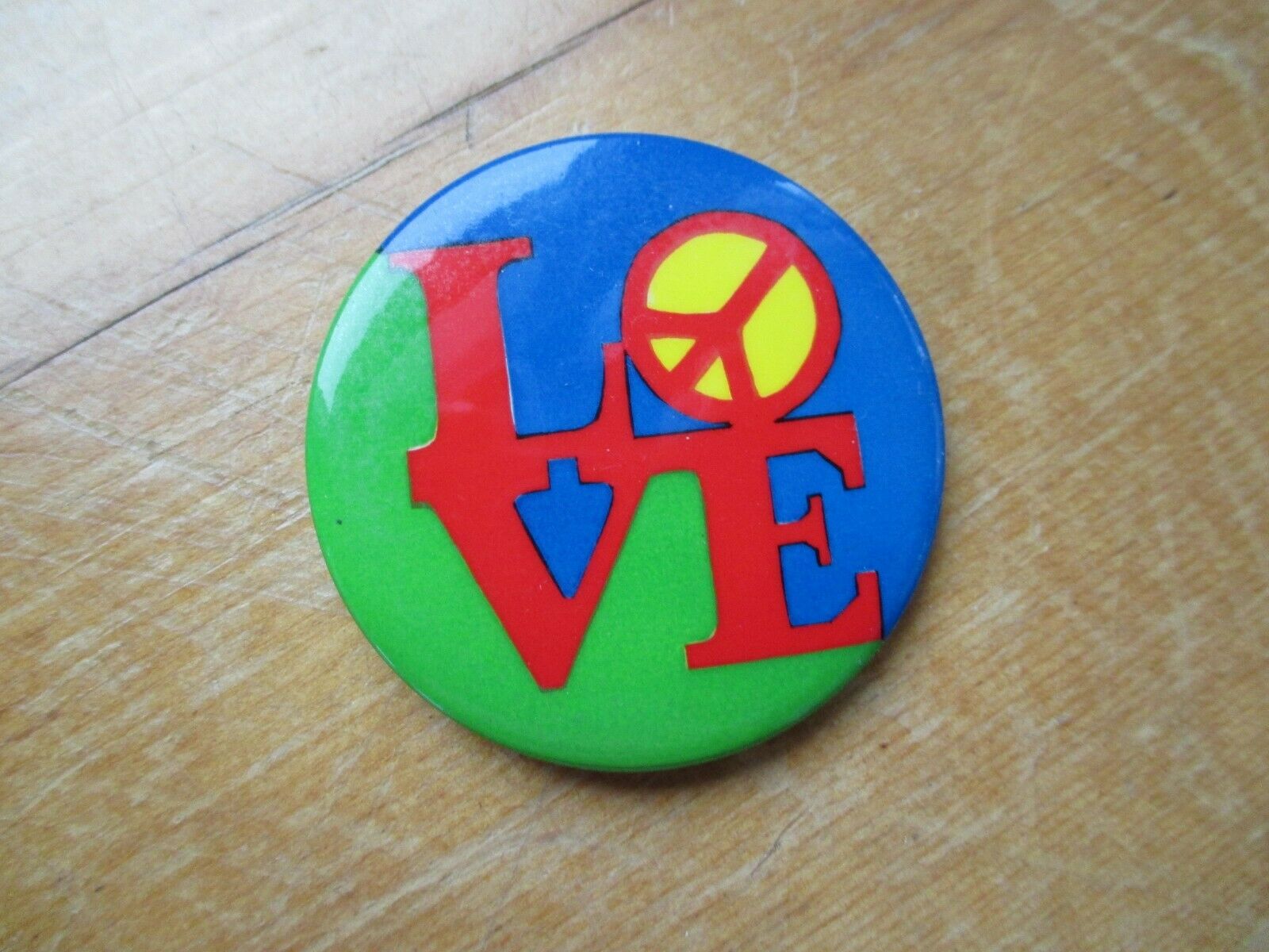 Title (ebay affiliate link): Vintage 1970s LOVE w/Peace Sign Colorful Pinback Button of Artist Robert Indiana