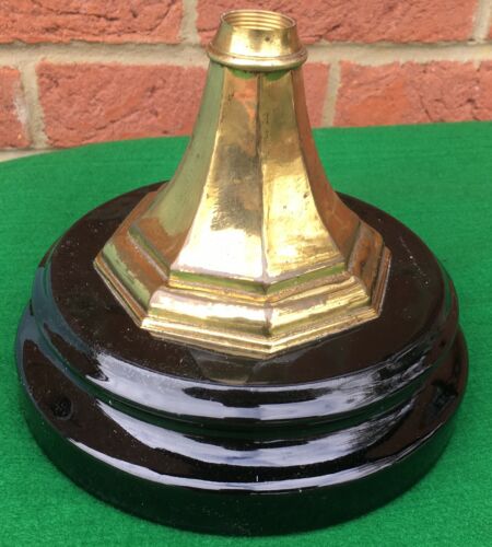 Antique Victorian Black Glazed Ceramic Porcelain Oil Lamp Base Brass Column Stem