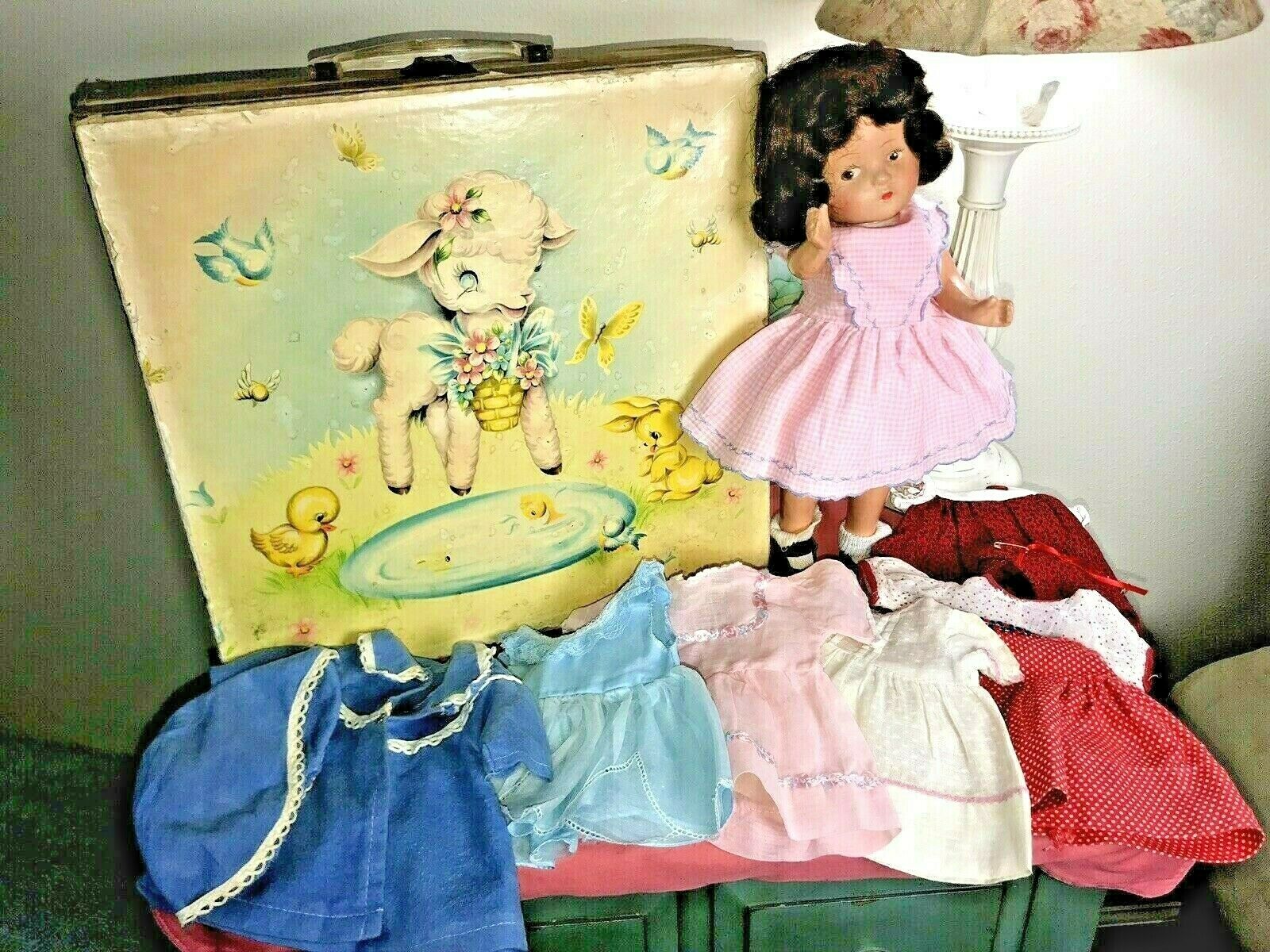 COMPOSITION Doll Lg Sz Margaret Holbrook TOYLAND SUITCASE 6 DRESSES Coat & Hat