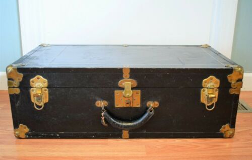 Title (ebay affiliate link): Vtg Black Wood Metal and Brass Accents w/ Leather Handle Foot Locker Trunk Chest