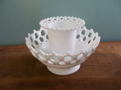 Vintage Milk White Glass Epergne~Lace Edge Vase & Bowl