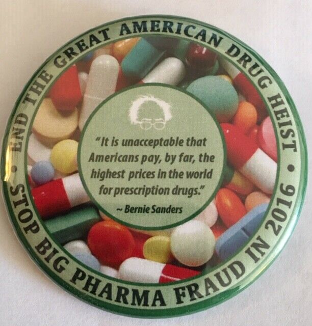 Title (ebay affiliate link): 2 1/4" Bernie Sanders Campaign Pin "Stop Big Pharma Fraud in 2016" Pin