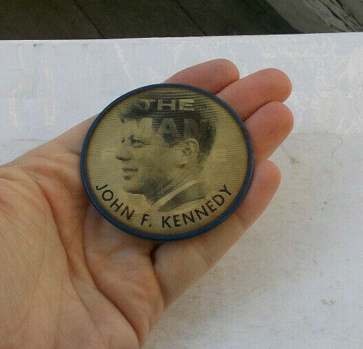 Title (ebay affiliate link): Vintage 2.5" JFK John F. Kennedy Hologram Button Pin Man For The 60''s Vari-Vue