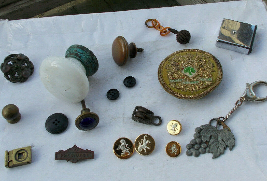 Title (ebay affiliate link): LOT Vintage Antique Door Knobs Milk Glass Brass Pins Buttons Pulley Tape Measure