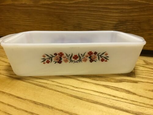 Vintage Fire King Primrose Bread Loaf Pan Reverse Stamp Floral Milk Glass