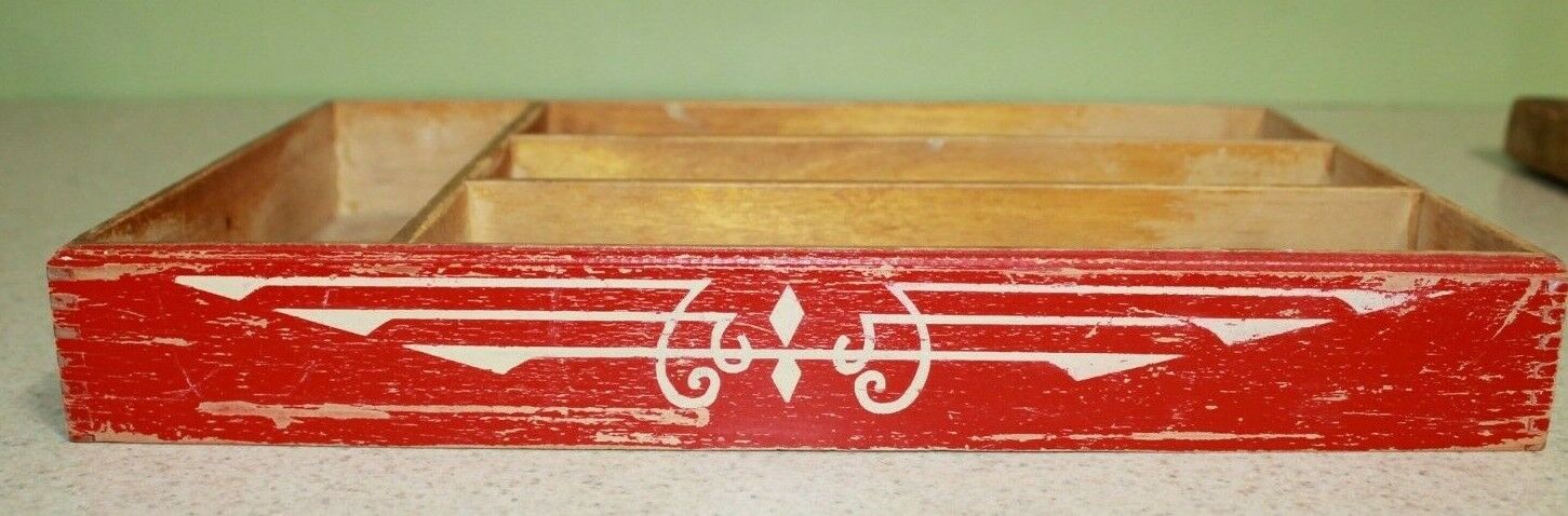 Vintage Wooden Silverware Utensil Tray Divider Box Red Dovetail Corners