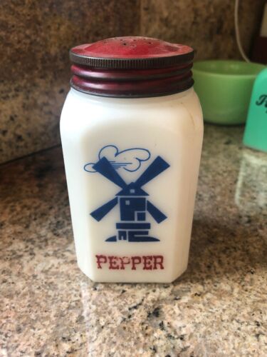Title (ebay affiliate link): Vintage Milk Glass Large Range SALT Shaker w/ Blue Windmill 4.5"