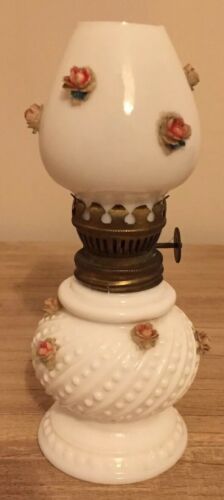 Title (ebay affiliate link): ANTIQUE MINIATURE OIL PIXIE/NURSERY LAMP WHITE STUDDED MILK GLASS.