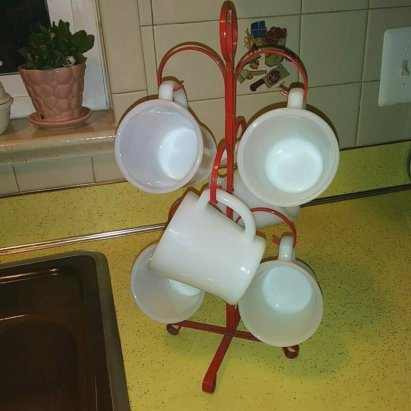 Lot of 6 White Vintage Anchor Hocking Fire King Milk Glass Mugs w/Tree Stand