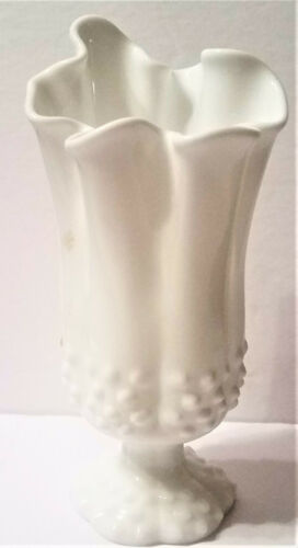 Vintage Hobnail Milk Glass Swung Ruffle Vase Crimped 7"