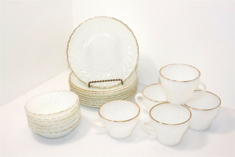 Fire King Milk Glass Gold Rim 5 Teacups 8 Dessert Plates 5 Bowls Gold Rim USA