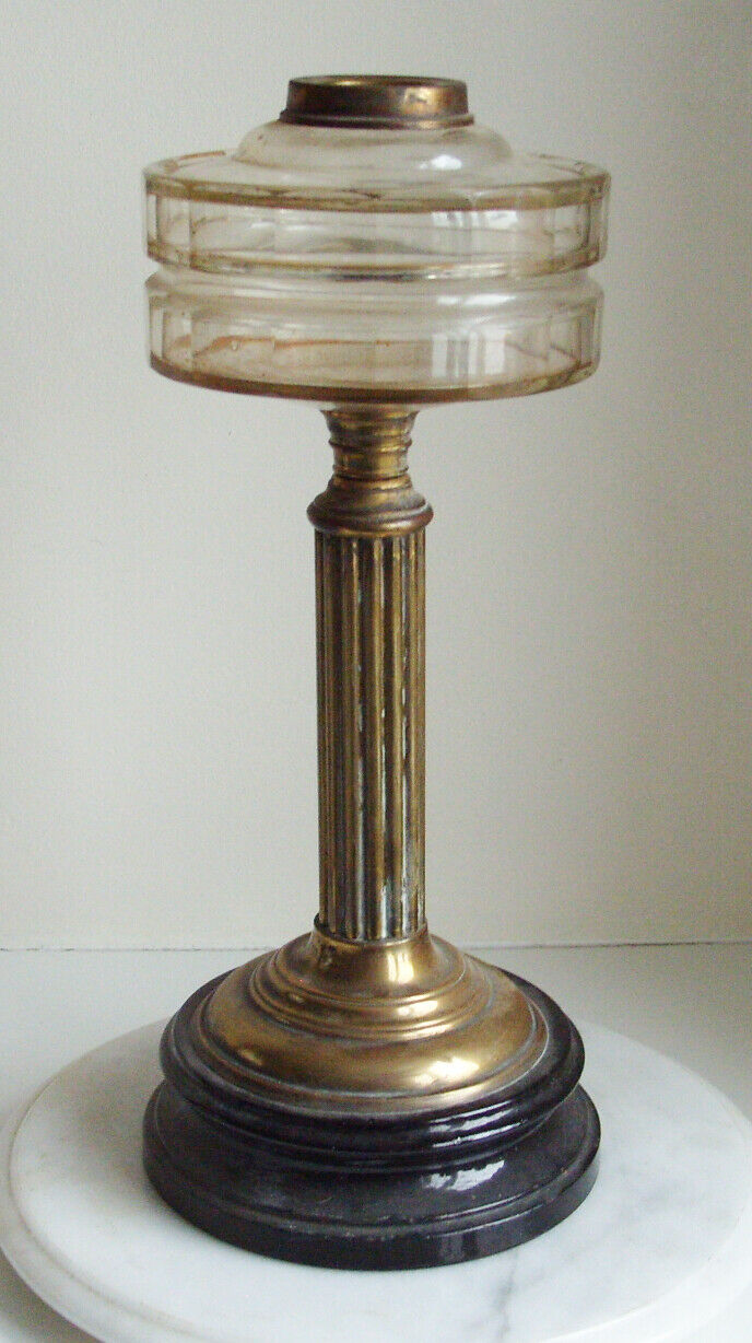 Title (ebay affiliate link): ANTIQUE EDWARDIAN/VICTORIAN CLEAR CUT GLASS OIL LAMP BRASS COLUMN