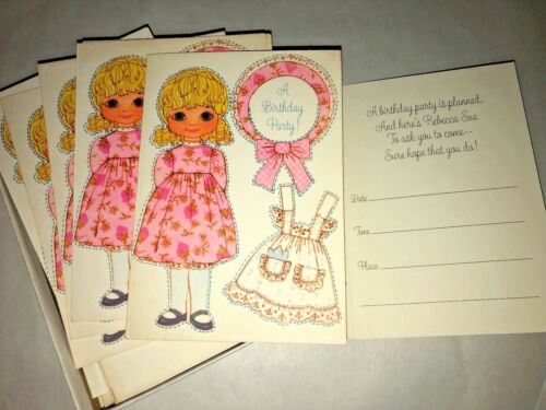 Title (ebay affiliate link): Vintage Hallmark 7 Rebecca Sue Paper Doll Birthday Party Invitations Cards