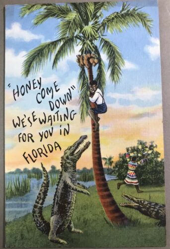 Title (ebay affiliate link): BLACK ETHNIC LINEN ERA POSTCARD 1940''S BOY UP COCONUT TREE, ALLIGATORS WAITING