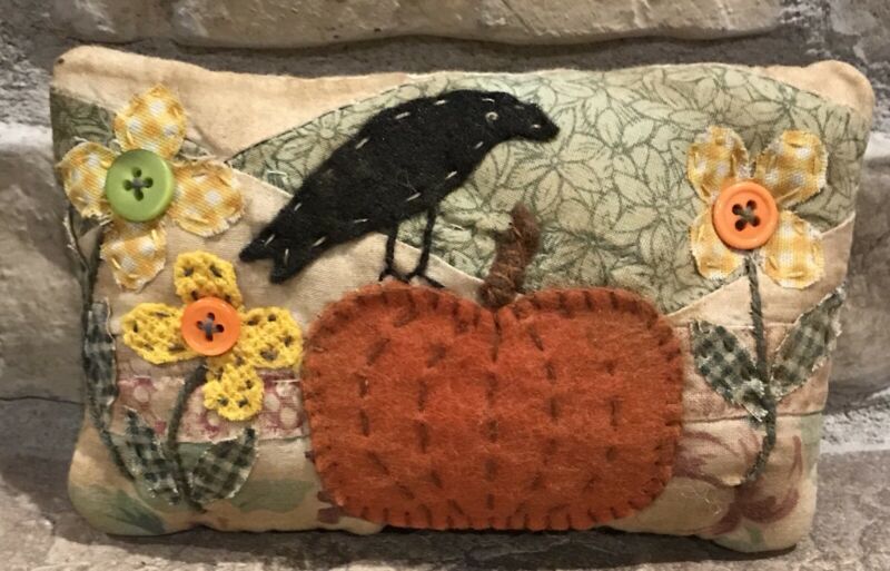 Title (ebay affiliate link): Very Primitive *Crow, Pumpkin & Flowers* Shelf Pillow- Made From Vintage Quilt