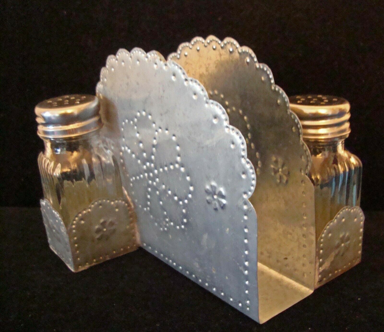Vintage Spanish Colonial style punched tin napkin & salt & pepper New Mexico