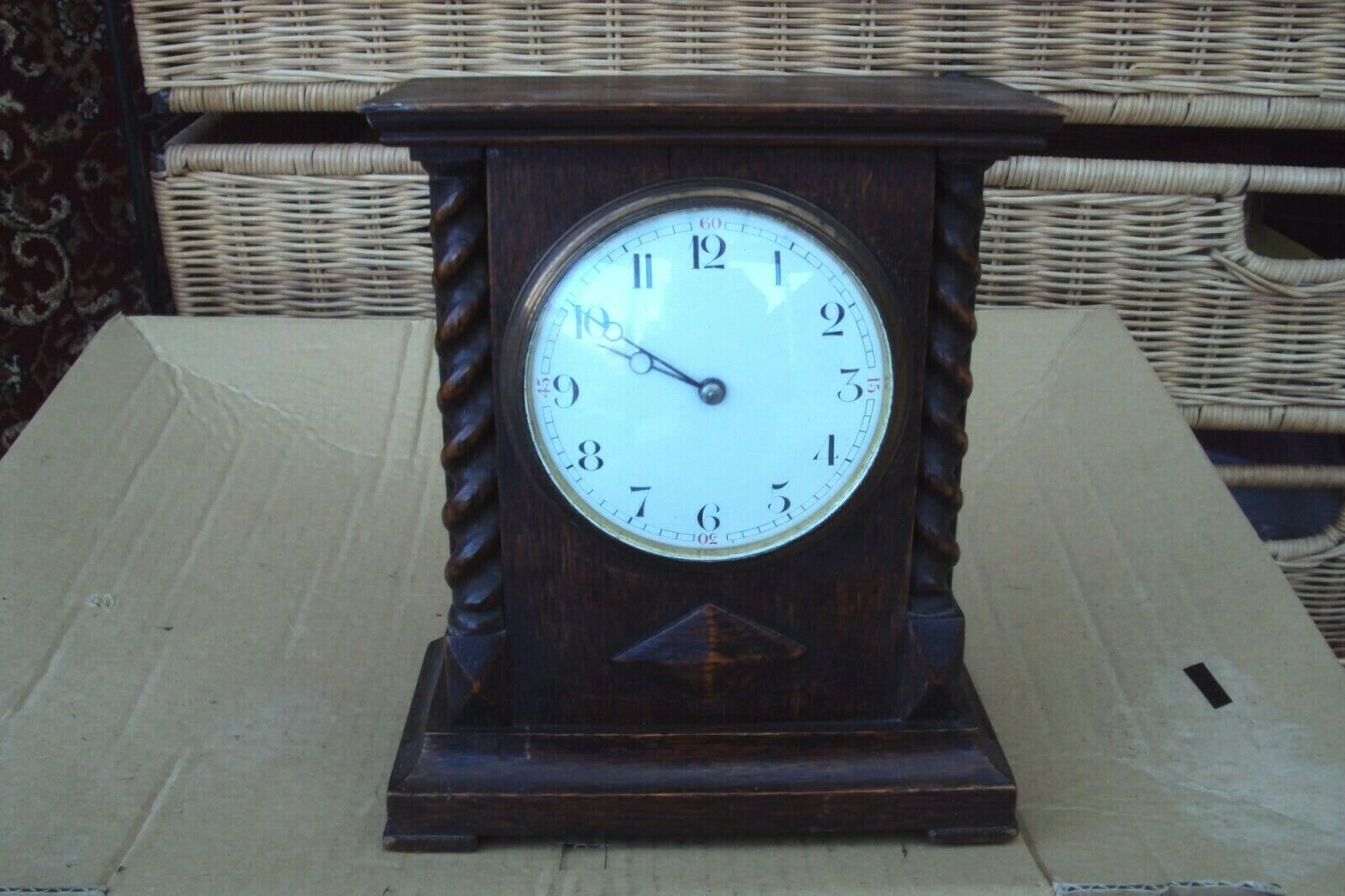 Title (ebay affiliate link): ANTIQUE WOODEN OAK MANTEL CLOCK WITH NICE FACE FOR SPARES OR REPAIR