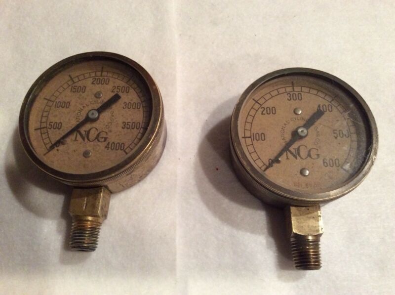 2 Vintage Brass Steampunk Pressure Gauges-Both National Cylinder Gas Co. Nice