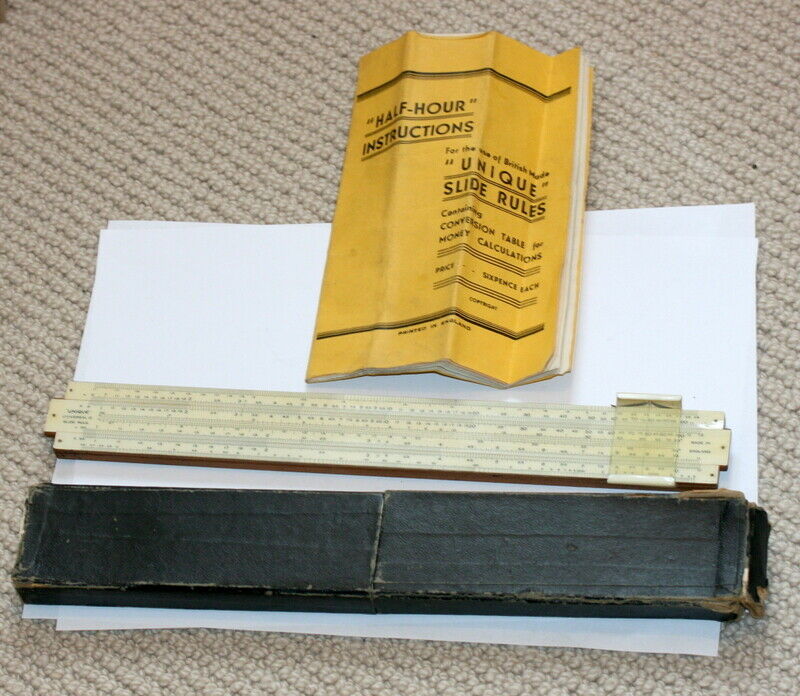 Title (ebay affiliate link): UNIQUE ENGLAND VINTAGE SLIDE RULE WITH INSTRUCTION BOOKLET SLIDE RULE GOOD COND.