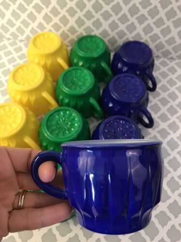 Vintage Lot of 12 Vibrant Colored Milk Glass Mugs, Unused, Cobalt, Green, Yellow