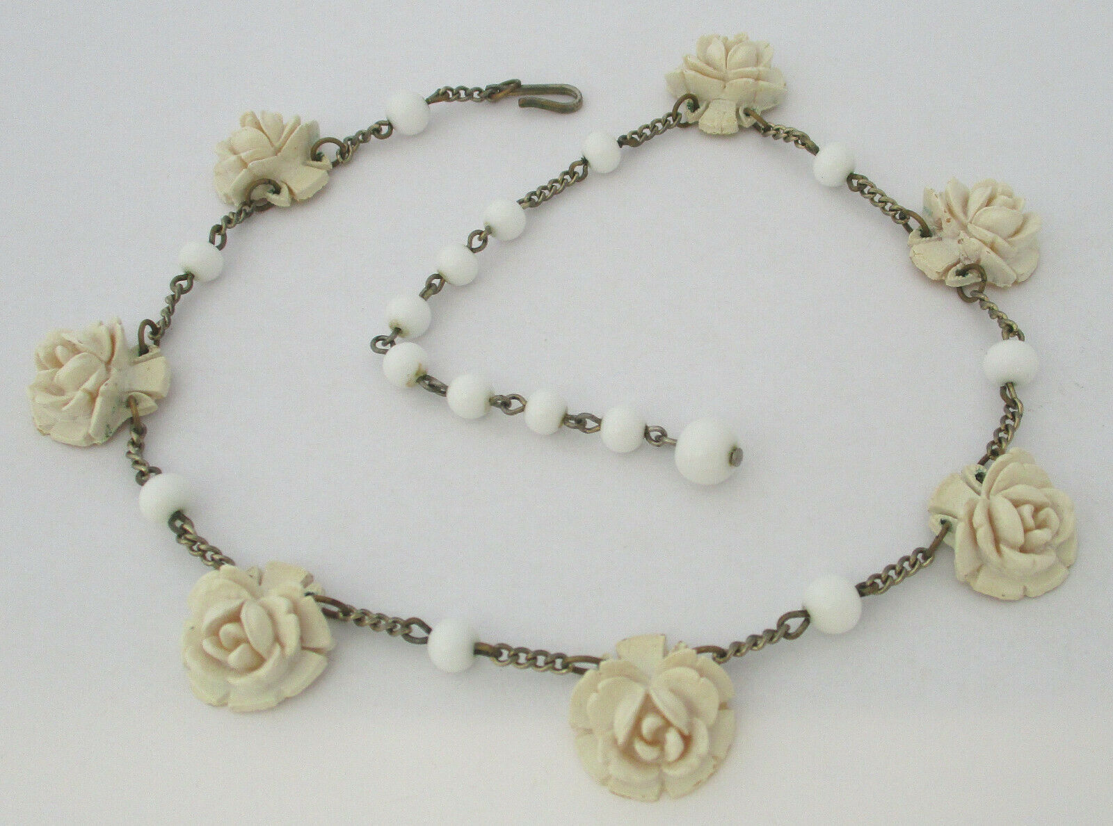 Vintage Carved Celluloid Flower/Milk Glass Bead Necklace
