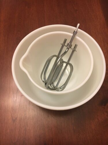Title (ebay affiliate link): 2 Vintage Hamilton Beach Ribbed Milk Glass Mixing Bowls #14, #12 And Beaters